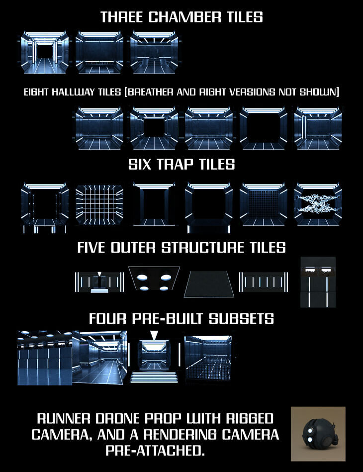 Featuring connector nodes to easily snap pieces together, you can build the labyrinth of your dreams or nightmares with ease, customize light colors and intensities, and even allow your audience to follow the action on monitors in the audience boxes with images rendered through the lenses of the ever-watchful Runner Drones.