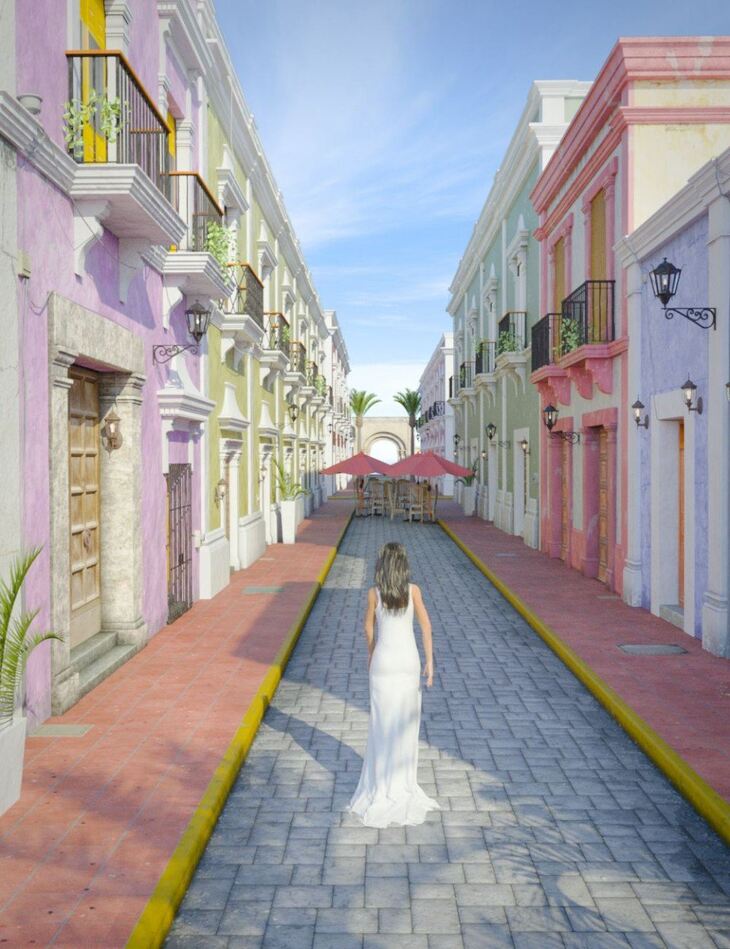 Caribbean Village is a main street right next to the ocean, which also includes a pool area, pier, colonnade, and two archways.