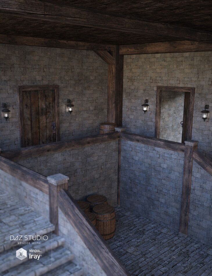 Castle Interior is an interior scene with 3 pose-able doors with stairs and barrels that load as a full scene Preload. (All objects are separate objs grouped together. So the walls, door, floors, ceiling, can all be individually selected to move around or can be hidden for added versatility with camera angles.)