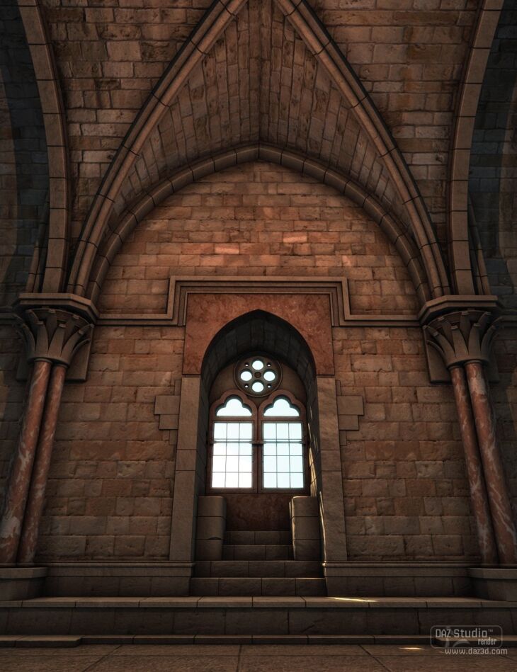 An interior castle room with a large window that is inspired from Castle Del Monte in Italy. The 3D software window opens and closes. DAZ Studio Materials, Lights and Cameras are included.