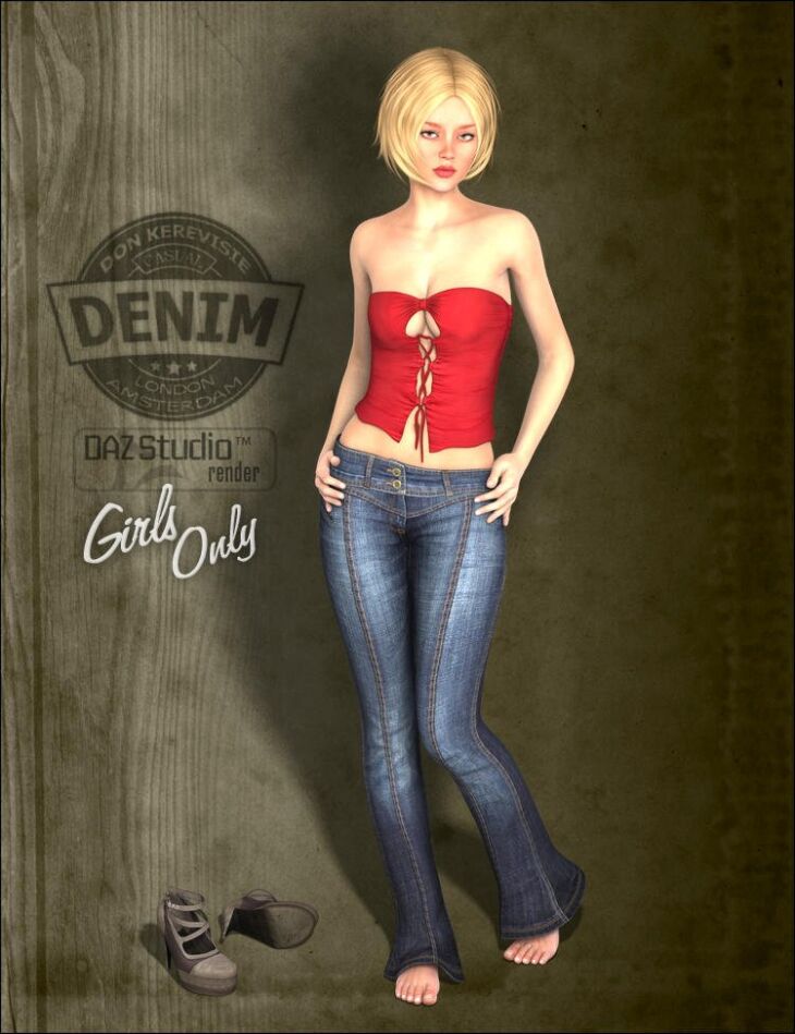 Casual clothing for Victoria 6, Gia 6, The Girl 6 and Genesis 2 Female(s), premiere 3D models, comes complete with top, jeans and high heels with photo-realistic textures.