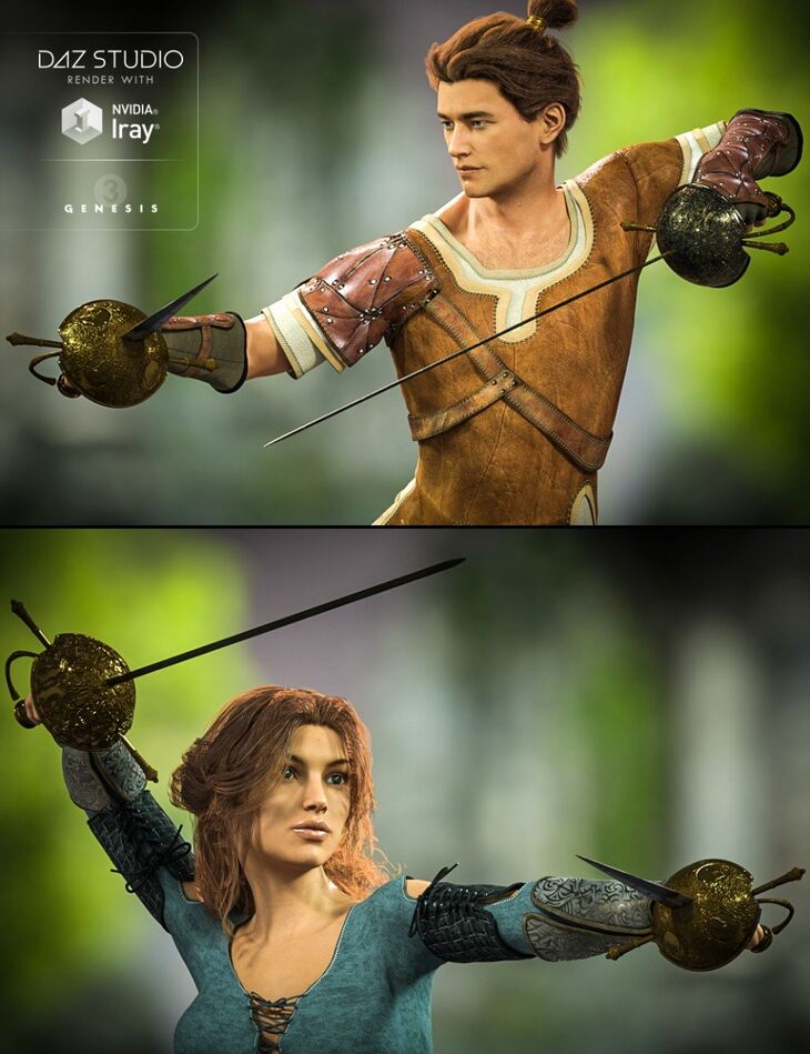 Cazoleta sword bundle includes a rapier sword, a rapier knife, some texture variations and some fencing poses presets for Genesis 3 Male(s) and Genesis 3 Female(s).