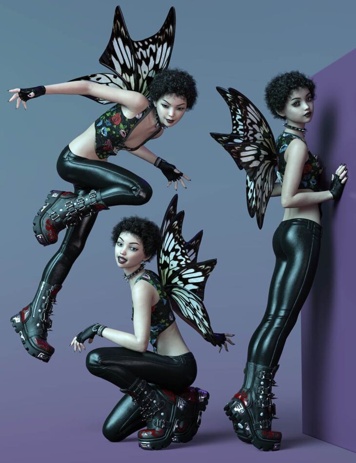 This artfully crafted set includes 20 darkly fanciful poses and 10 moody and complimentary expressions for Daisy 8 and Genesis 8 Female. A must-have for all your dark fairy art!