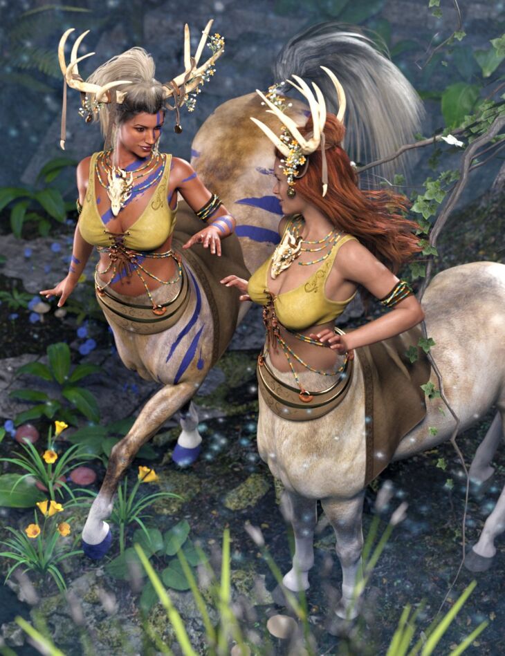 Centaur Grove Outfit for Genesis 8 Female Centaur gives your magical creatures have everything they need. The outfit includes horns with ribbons (with pose controls for the ribbons), a skull necklace with a magical gem, a top, armbands and a decorative blanket.