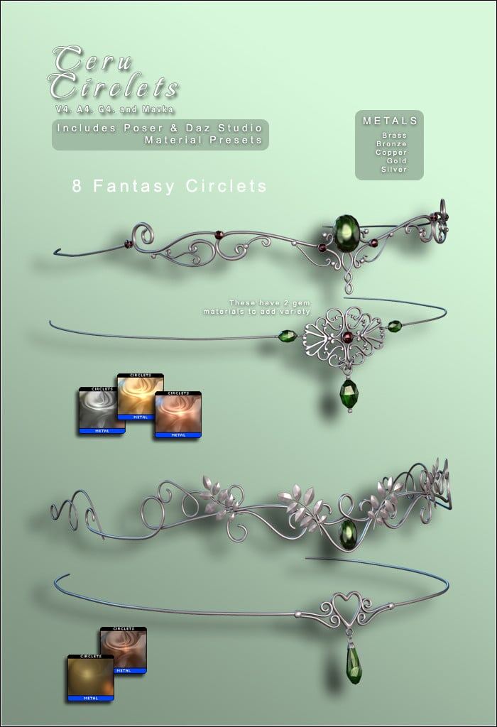 A lovely collection of 8 finely crafted head pieces for use with Victoria 4, Aiko 4, The Girl 4, and the ever adorable Mavka. Each character has her own set of 8 circlets made just for her.