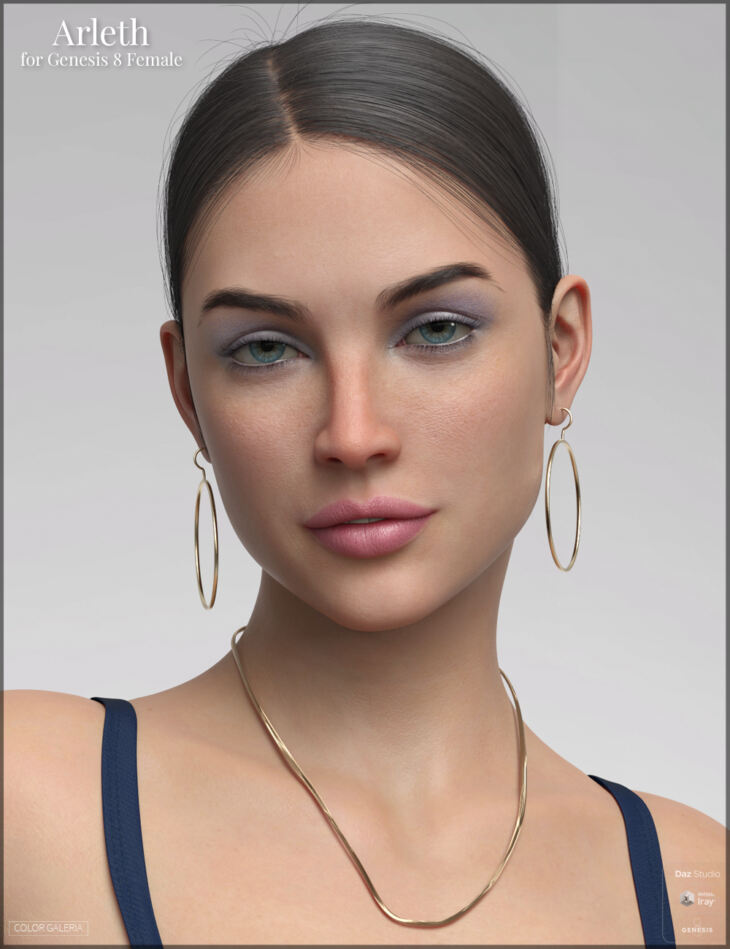 Arleth is a beautiful lady, she is a custom character sculpted using the base Genesis 8 Female figure, no additional morphs needed.