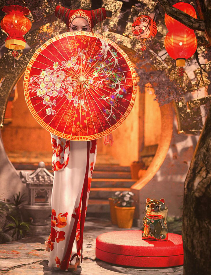The arch, lanterns, tiger, umbrella, and lucky cat with cushions will help you celebrate the Year of the Tiger and bring good fortune to your scenes.