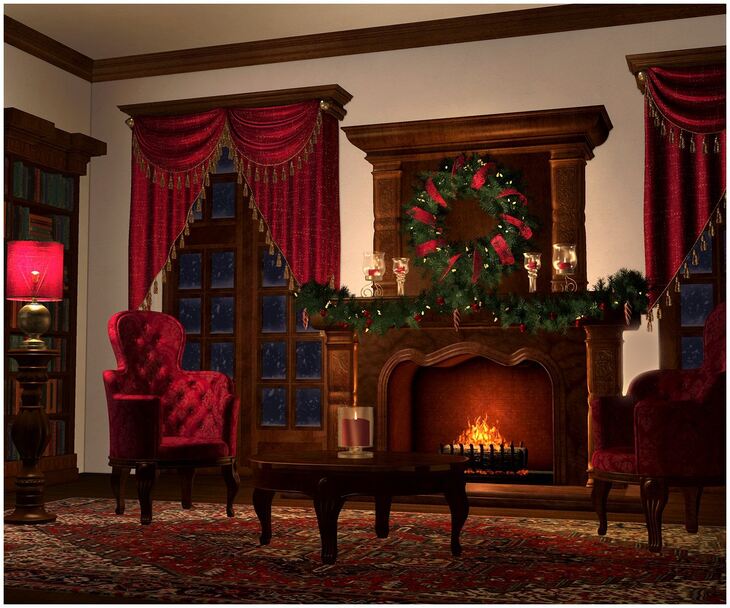 This is an idyllic, festive scene in a classical room during winter holidays. Snowflakes on the window glass, warm lighting, candles and the fireplace work together to create the perfect traditional, vintage Christmas setting.