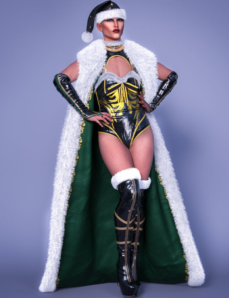 The Christmas for All dForce Outfit for Genesis 9 is a set that consists of a gown, gloves, boots, Santa hat, necklace, and bodysuit with a variety of textures and colors.