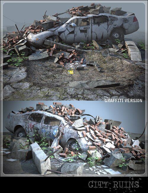 A ruined vehicle diorama ideally suited as a background object to Stonemason's 'City Ruins' Buildings. Comes with 3 texture variations plus a bonus clean version of the Police car.