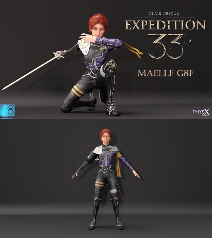 Clair Obscur: Expedition 33 - Maelle G8F is packed with a custom in game body shape morph that is very similar to the original body, skin, and eyes. Maelle's weapon Maellum is also included with base and golden.