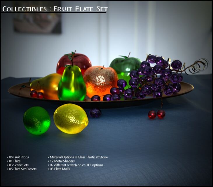 This fruit plate set includes a variety of fruit as well as scene subsets to load prearranged sets.