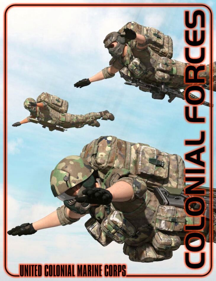 The Tactical Assault Outfit goes Colonial Forces for Genesis 8 Male; Welcome to the Hard Corps, the United Colonial Marine Corps top uniti. Here, you'll be issued more combat uniform items including a hard and drop packs. Bugs, dinosaurs, little green men, doesn't matter, this time it's war.