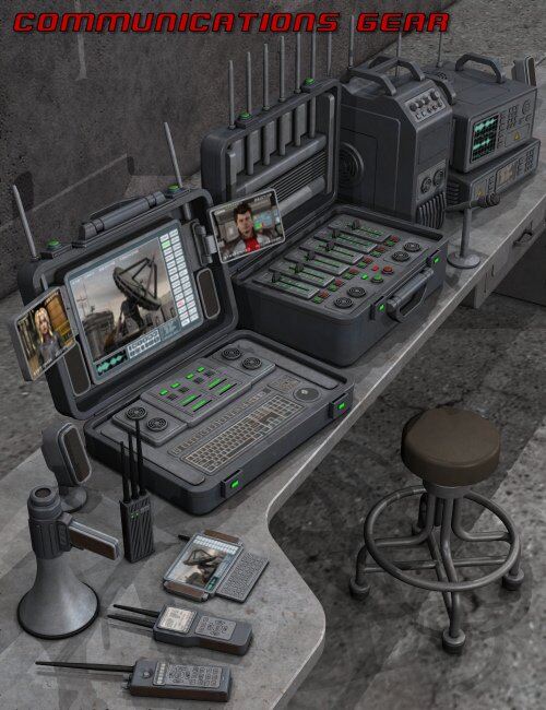 A comm terminal, booster amplifier, encoder/decoder, satellite uplink, signal jammer, microphone and speaker. Plus some hand equipment for those on the go - a field radio, comm pad, GPS receiver, handheld signal jammer, and a bullhorn for when all else fails. Also includes a comm desk in stand-alone and 'loaded' versions and a stool with adjustable seat.