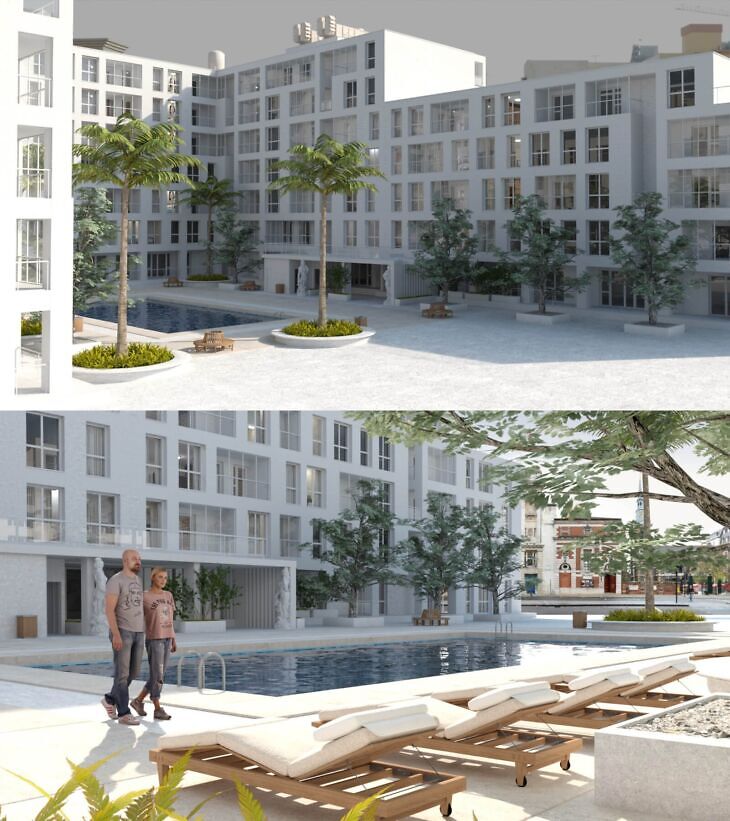 This is a modern condominium with both external and internal scenes. It has a separate room interior that can be duplicated on all floors. It also has a swimming pool to cool yourself off.