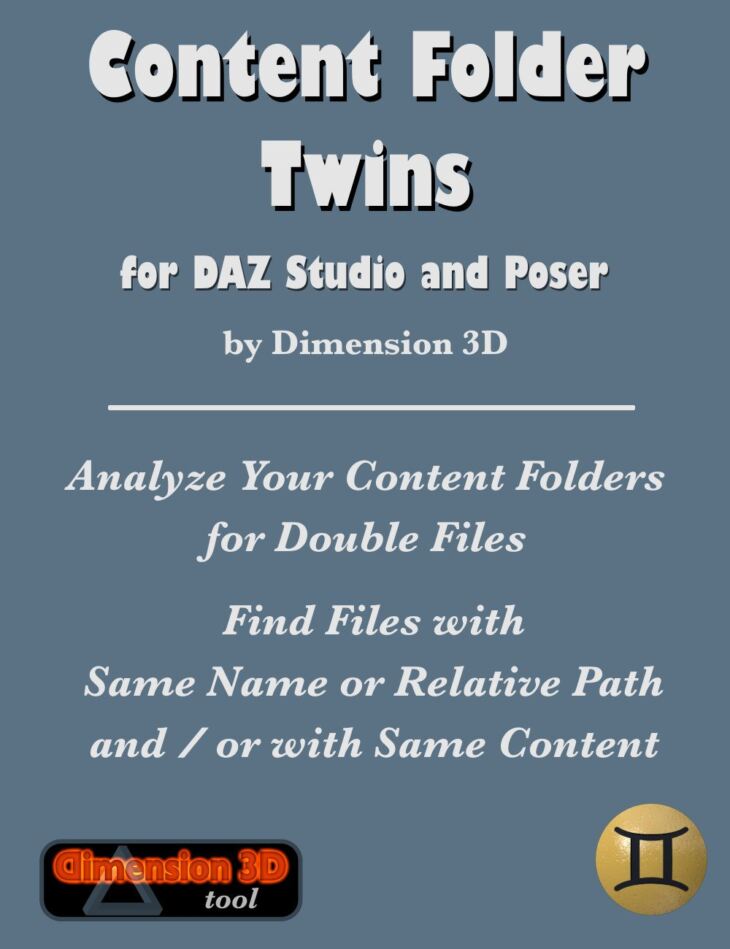 Content Folder Twins detects double files in the content folders of DAZ Studio and Poser. It either compares files by the file name or relative path, by their content, or both.