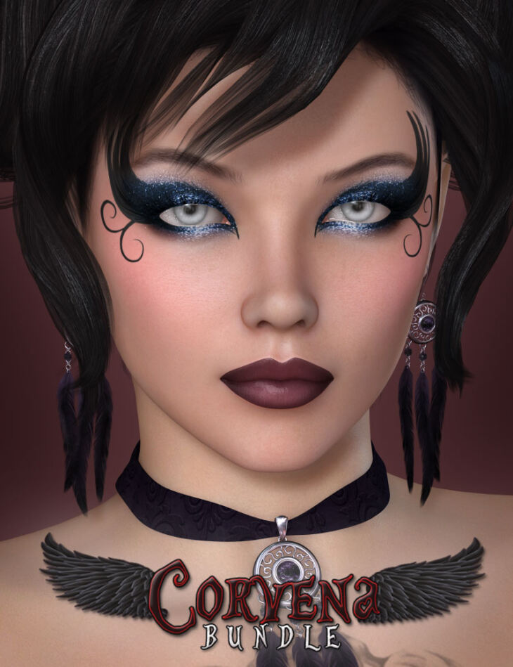 Corvena, a premiere 3D model, is a mysteriously dark and enchanting beauty for Victoria 4 and Genesis, and in this bundle she comes complete with a dark and elegant three-piece jewelry set.