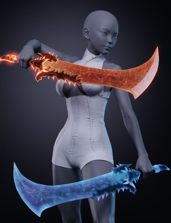 Crimson Blades are weapons designed for the Crimson Dragon Outfit but they can be used with whatever you like. The set includes 4 swords for right and left hands, 4 color textures, and poses for each hand.