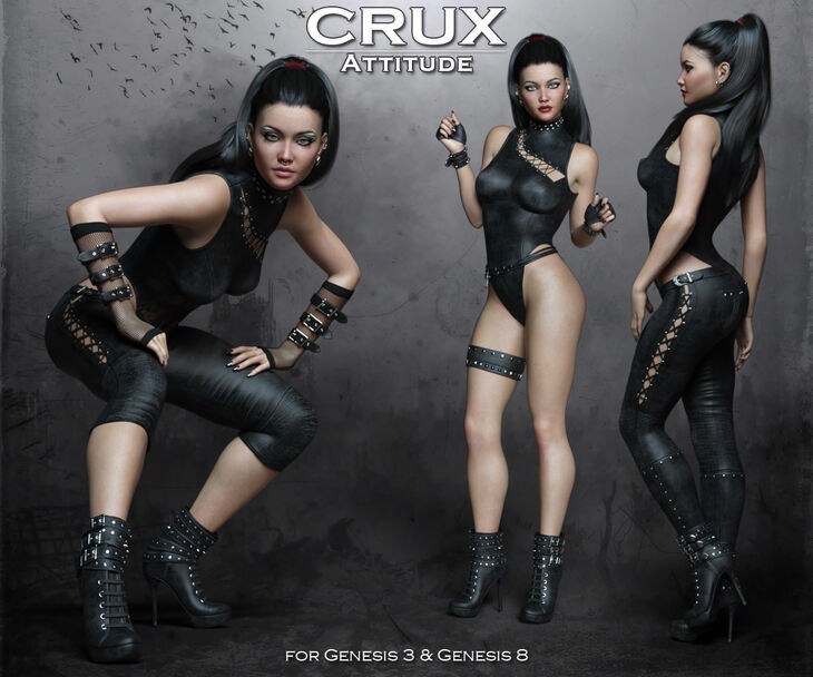 CruX Attitude is a new clothing pack for all your Genesis 3 AND Genesis 8 Females. As always, lots of leather, studs, buckles, straps, laces and endless possibilities to mix with all the CruX packages.