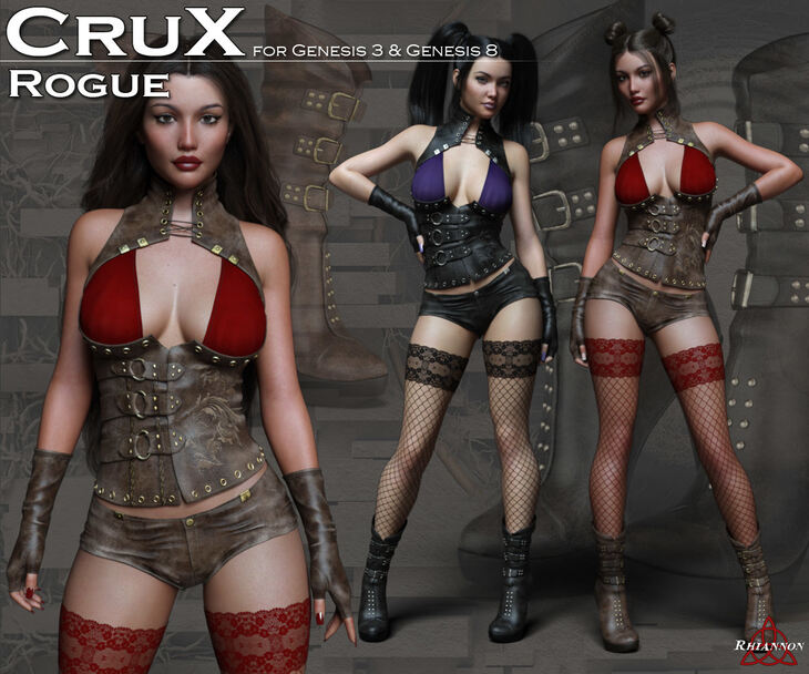 CruX Rogue is a new clothing pack for all your Genesis 3 and Genesis 8 Females. Lots of distressed leather and metal, and as ALWAYS, mix and match this outfit with all your other CruX and NyX outfits for endless possibilities!!
