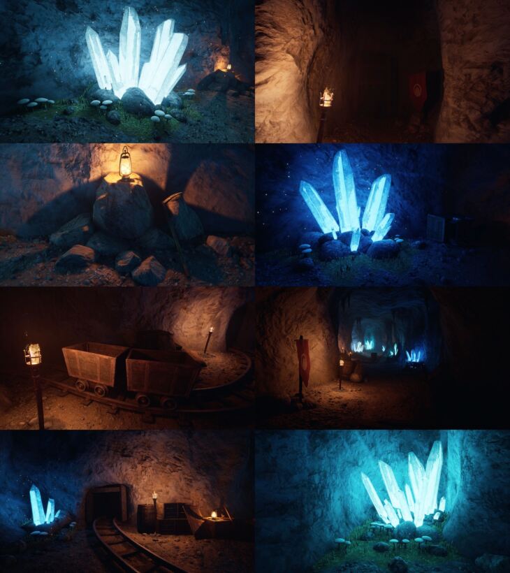 Crystal Mines scene features a selection of assets you can use to create your own fantasy underground world: a variety of rocks and crystals with unique shader and vegetation such as moss and mushrooms, rail tracks to use with splines, mine carts, mining tools, and other!