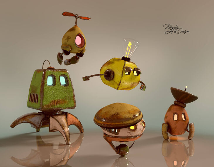 Cute flying Robot and Friends by MysticArtDesign.