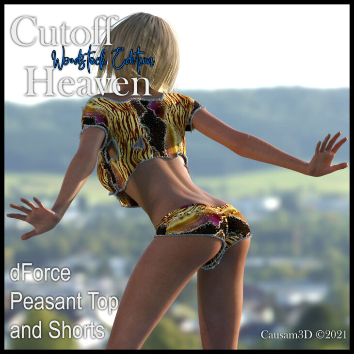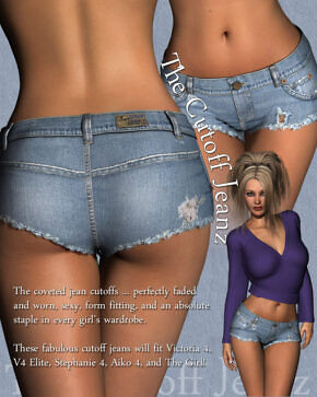 Cutoff Heaven Woodstock Edition: This is a hippy girl ensemble. It comes with a "Peasant" Top and a pair of shorts. There are a variety of textures for each. You can mix and match, and either add a fuzzy "cutoff" edge or leave it as is. VERY easy to use.