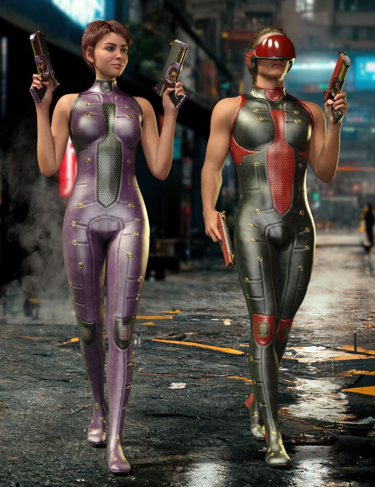 Cyberpunk Enforcer for Genesis 9, a Cyberpunk outfit from Midnight Stories, is a sleek and elegant suit with a Cyber Headset and conforming guns.