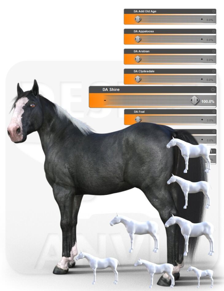 Included in this pack are 8 Breed shapes for Daz Horse 3 and the DA Ultimate Morph Pack.