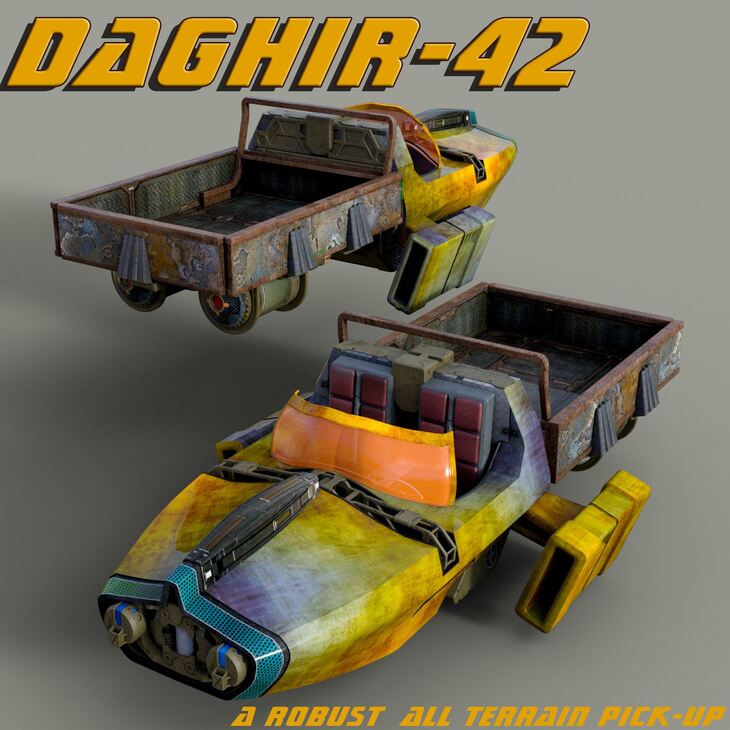 Daghir-42, nicknamed Dag, is a strong pick-up used to transport mecha part during the Technowar. You can find it in several junkyard expecting a new life. It's conception and design are issued from old Italy, meaning the pilot place is cosy and the equipment is quite rich. Available right now in my new shop.