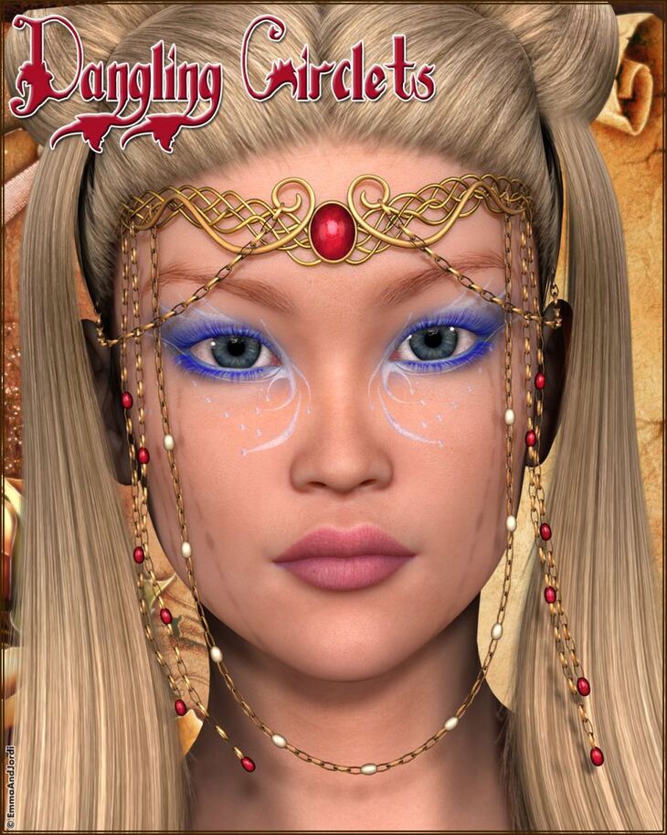 Dangling Circlets For Any Figure is a set of five circlets with hanging chains that can be used with any figure. By default they fit to Genesis 2 Female, but we also included fit morphs for the most common figures (male and female) for faster and easier fitting.