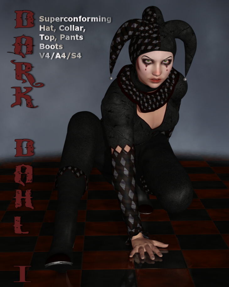 Dark Dahl-1 is a dark jester outfit, made exclusively for GypsyAngel's and Chevybabe25's Vialle, but it can be used for any V4, A4, or S4 character.