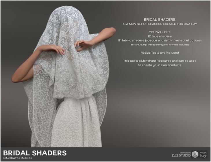 Daz Iray - Bridal - if you need some bridal fabric and laces, this set is perfect for you. You will get 10 high quality lace shaders and 21 fabrics (opaque and semi-transparent sheers). Resize and bump tools are also included.