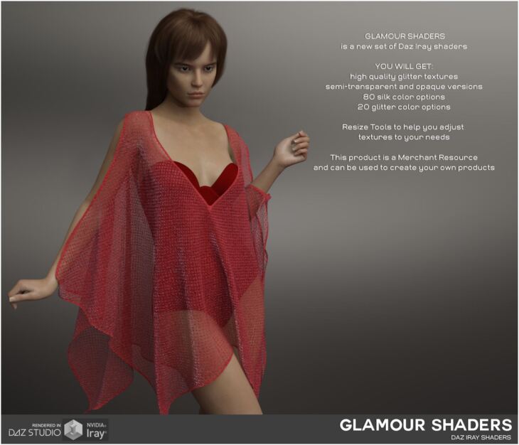 Daz Iray - Glamour Shaders - high quality shaders for Daz Studio Iray. You will get glitter texture saved as daz iray shader, opaque and semi-transparent versions.