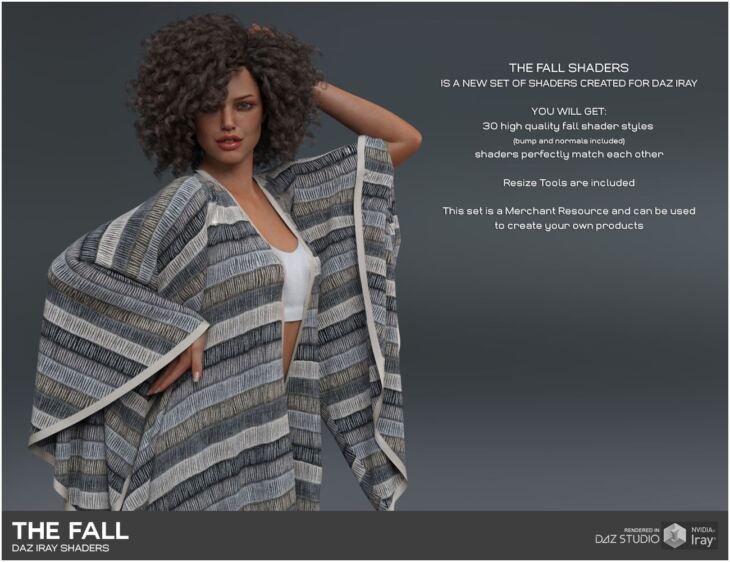 Daz Iray - The Fall - new set of shaders for for Daz Studio Iray. You will get high quality autumn inspired fabric shaders. This set was created using real fabric photo references. Textures included are: basic, bump and normal maps. Resize tools can help you adjust textures to your needs.