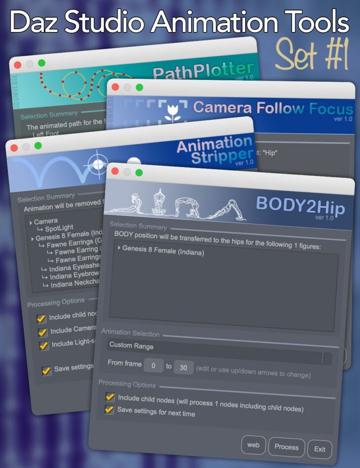 Daz Studio Animation Tools - Set 1 is a set of four tools that can help in the process of creating animations in Daz Studio.