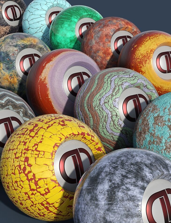 DD PBR Ceramic Shaders for Iray Vol 2 includes 18 unique presets with Enamel Sponged Ceramic, Enamel Striped Ceramic, Glazed Patch Ceramic, Painted Weathered Ceramic, Scorched Damaged Ceramic and Undulating Pattern Ceramic.