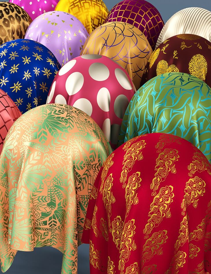 DD PBR Silk Shaders for Iray come in 64 stunning base colors. On top of the base colors, we have 27 gorgeous patterns to choose from, derived from a variety of genres. The patterns can be applied using any of the 64 pattern colors, making for a vast set of color combinations.