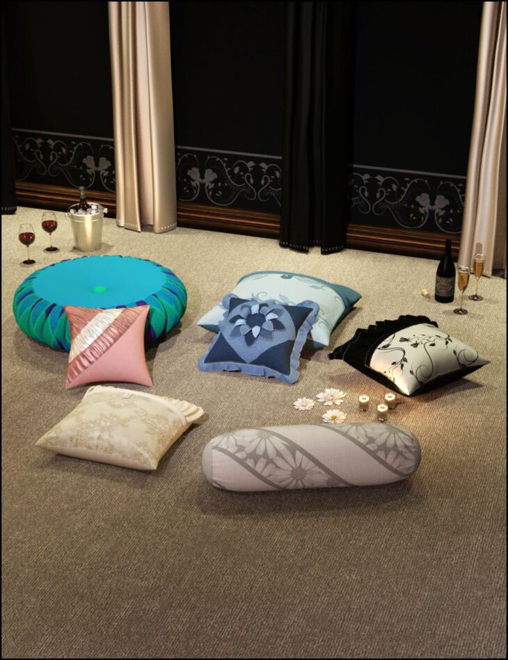 A set of lovely, detailed throw pillows to populate your living room or bedroom scenes.