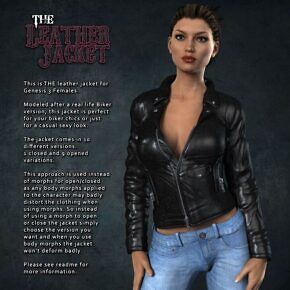 The Denim and Leather Jacket will auto-fit to any Genesis 3 Female morph using auto-follow in DAZ Studio 4.6 or higher, although most popular G3 morphs were custom created for a perfect fit.
