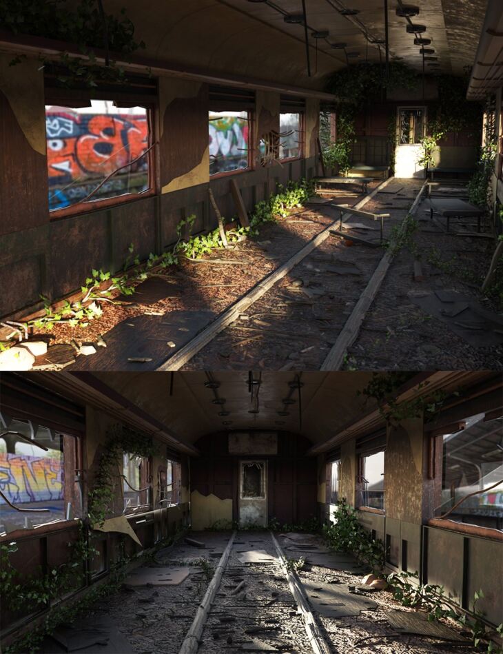 Inside you'll find the muddy floors with plants growing, surrounding the whole train, and see the railway track already.
