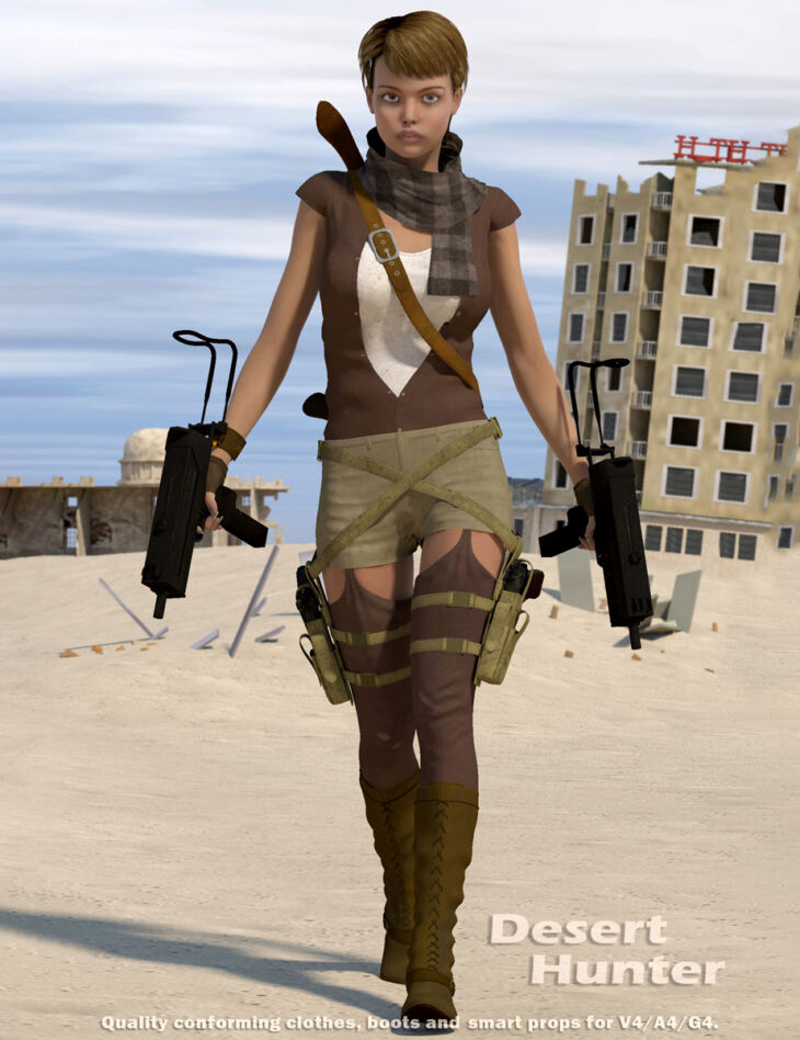 "Desert Hunter" - Hi quality, hi polygonal, well designed clothes and boots conforming figures (.cr2) + smart props for V4.2 base.