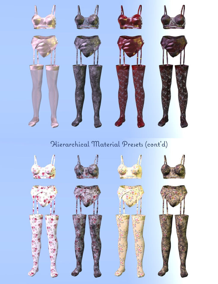This set consists of a Bra, Undone Bra, Garters, Undone Garters, Panties, and Stockings for the Genesis 9 and Genesis 8 Female figure, and a selection of material, shader, and dForce presets. The Genesis 9 version is optimized to work with the Genesis 9 Base Feminine shape.