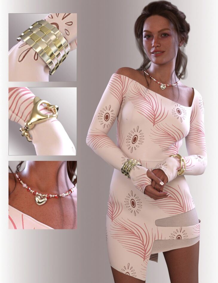 The Adele Outfit for Genesis 9 is a dress with a unique design and long sleeves that tighten, along with 2 spectacular bracelets on the wrists. A necklace with a heart pendant is also included.