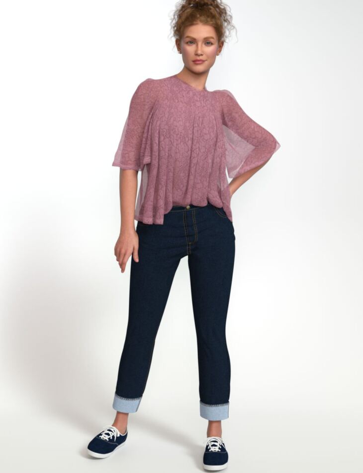 Angie Cuffed Jeans Outfit is perfect for casual wear. The jeans reflect today's fashion with rolled cuffs. The jeans were made for dForce but work well for most poses as conforming. Jean colors are dark blue, deep blue, light blue, and medium blue. The jeans can be worn by both female and male characters.