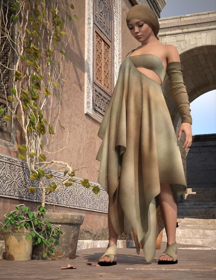 dForce Anya Outfit for Genesis 9 is a 5-piece set including dress, top, headwear, sleeves, and shoes.