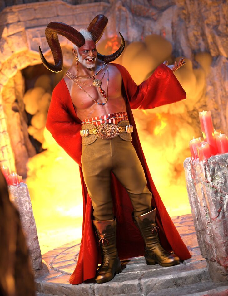 Unleash your inner demon with this fantasy outfit, featuring a dForce-enabled robe for natural draping and movement, with control handles for easy posing of the thighs and shins. The set also includes a necklace with rigid follow node pendant, a belt, and boots, creating a complete look for your supernatural scenes.