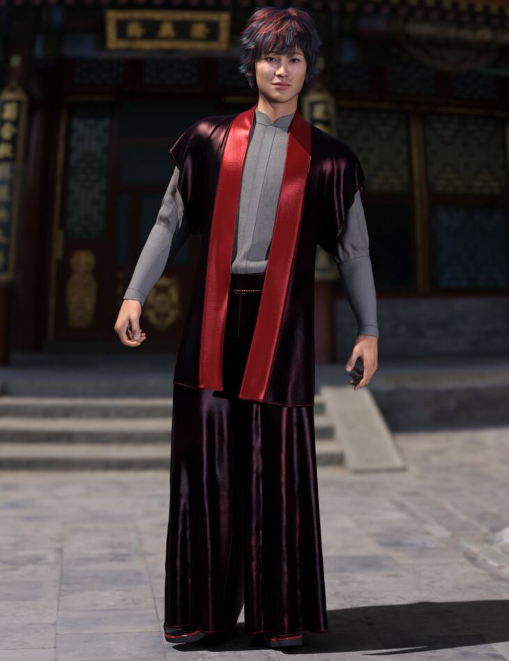 The dForce Asian Street Fashion Outfit for Genesis 9 consists of a linen long-sleeve shirt in various colors, wide-leg silk pants, a pair of work-style fashion boots, and a silk jacket with embroidered motives on the back.