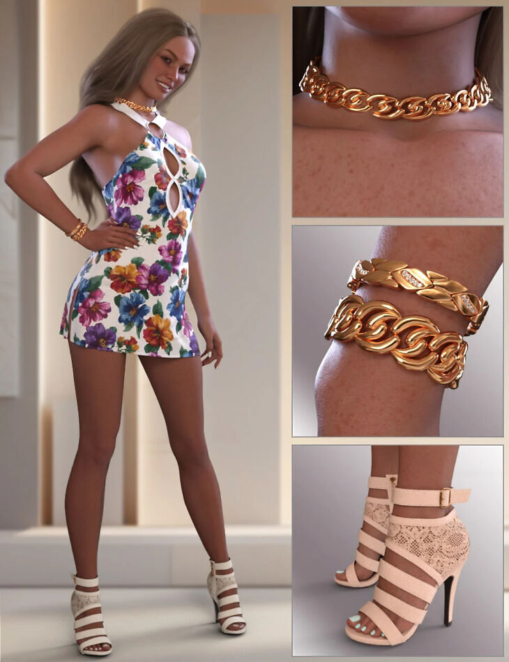 A vibrant and stylish summer ensemble featuring a floral mini dress with bold cutouts, lace-up high-heeled sandals, and statement gold accessories, including a necklace and bracelets. Supports dForce for realistic fabric draping.