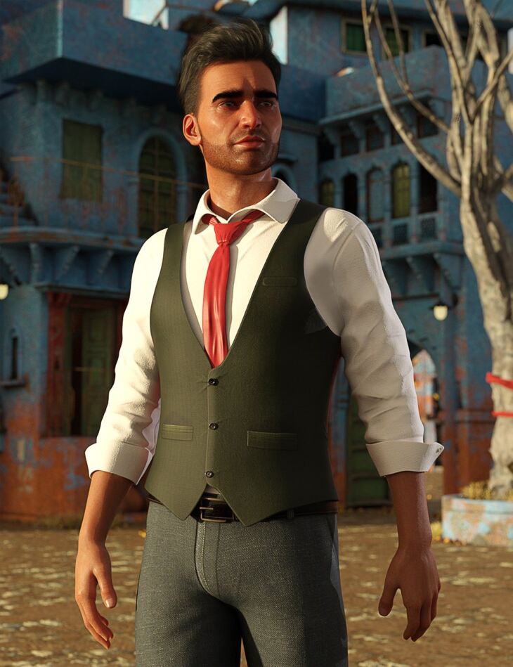 dForce Casual Vest Outfit for Genesis 8 Males is made up of a shirt and tie, vest, pants, belt, and shoes. There are 6 texture sets provided for the vest, 4 for the pants, and 3 for the belt and shoes. The product is made with dForce but works well in most poses as conforming.